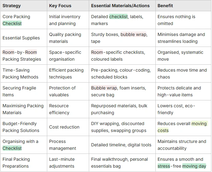 Before you embark on your move, review this table to understand how each strategy contributes to an efficient packing process in Brisbane. By applying these detailed tips, movers can enjoy a coordinated and stress-minimised relocation.