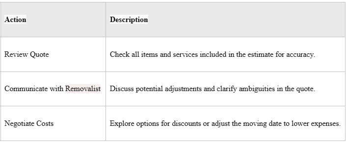 If a furniture removal cost estimate appears too high, clients should first review the quote in detail to ensure that all items and services are accurately represented. They may find it beneficial to engage in a discussion with their removalist to clarify any ambiguities or request adjustments based on their specific needs, such as reducing the volume of items or changing the moving date to an off-peak time. By actively communicating and negotiating, individuals can explore options to manage costs effectively while still securing the necessary services for their relocation:
