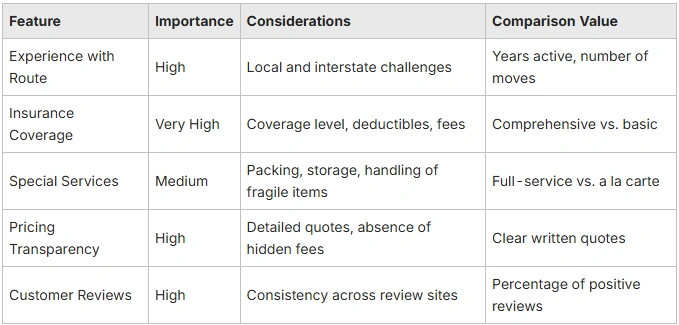 Before finalising your choice, use a table to quickly compare the key features of various moving companies.